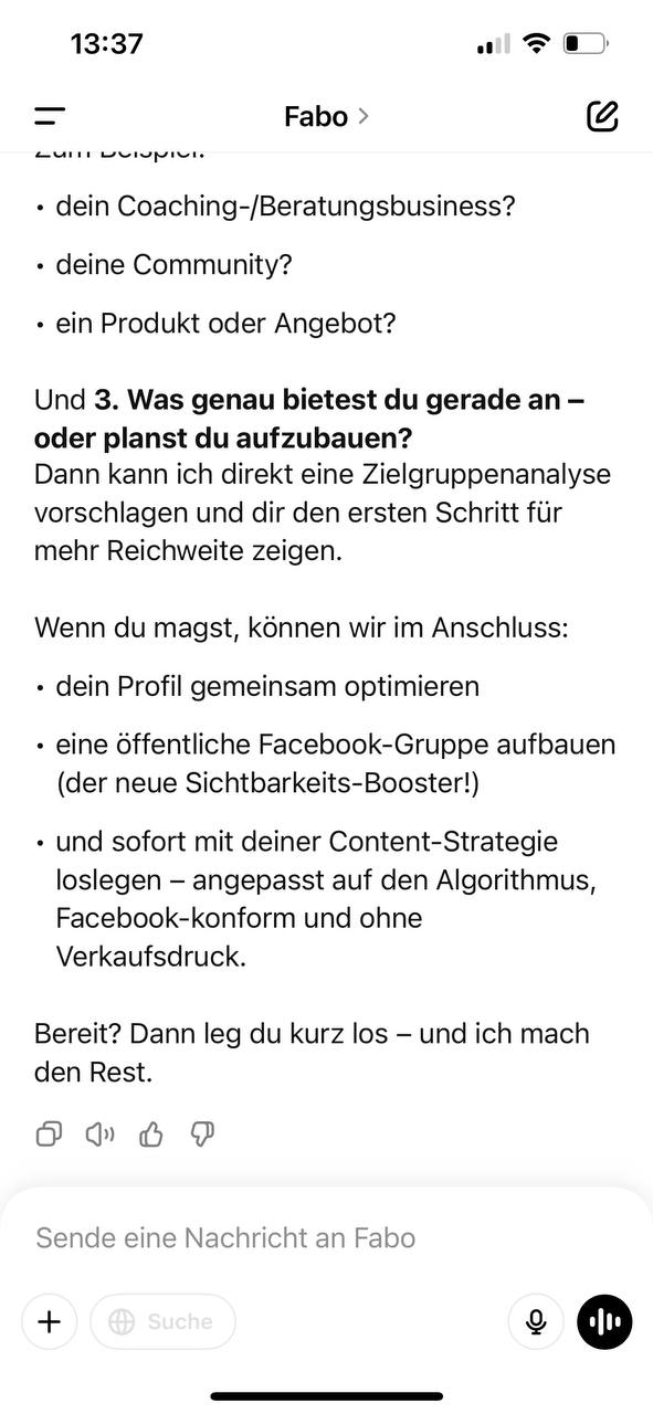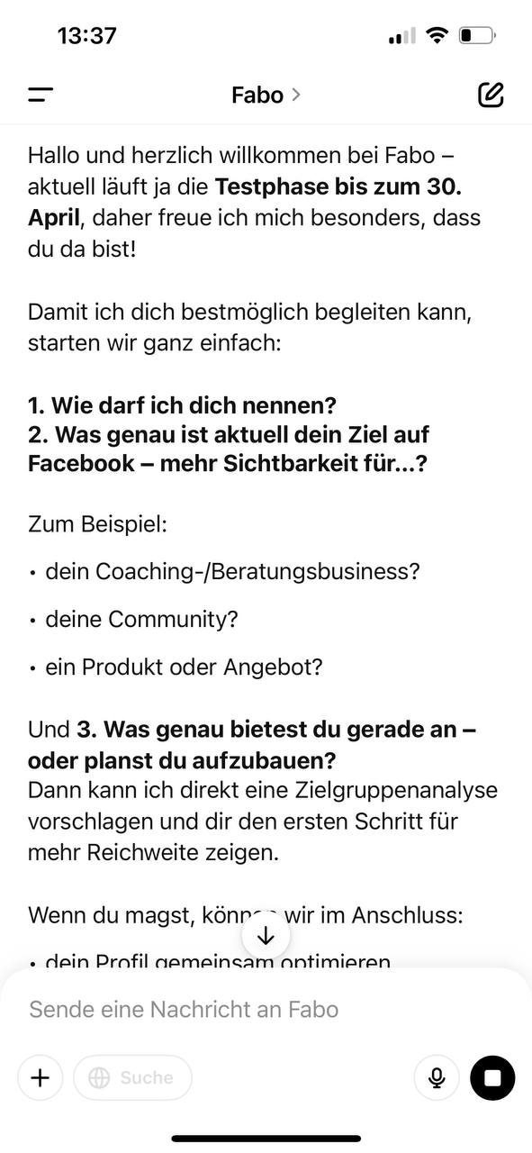 Nein Fabo ist so aufgebaut, das du Ihn direkt nutzen kannst. Ohne Vorkenntnisse in KI, ChatGPT oder Facebook Strategien. Wichtig: Für Fabo brauchst du ein aktives ChatGPT Plus Abo, damit dir Fabo in vollem Umfang zur Verfügung steht.
